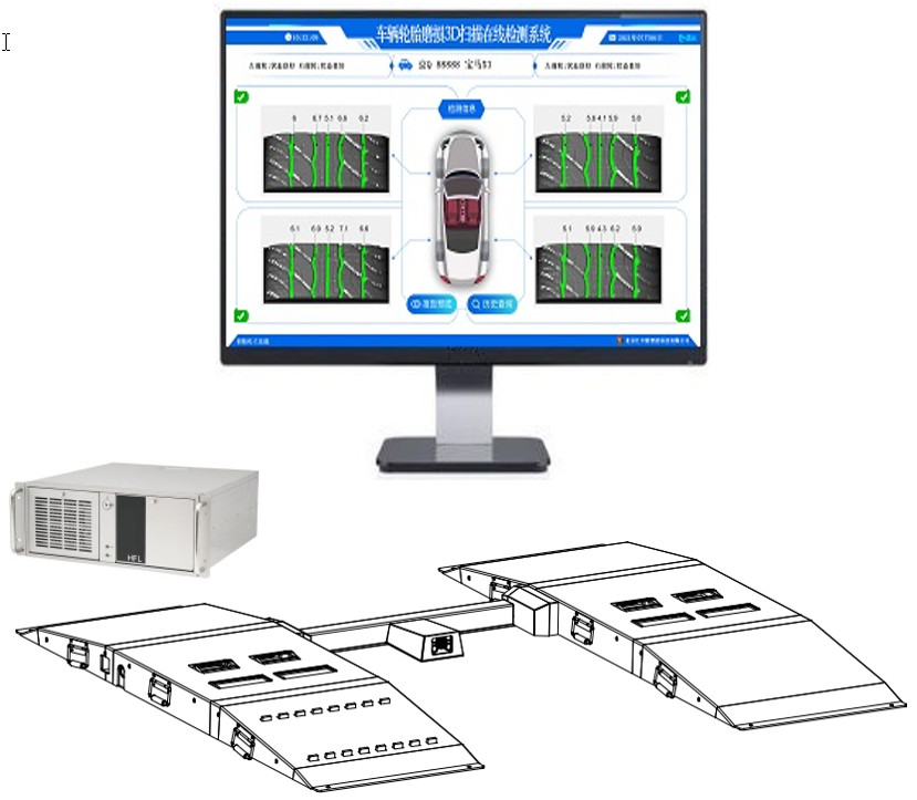 本系統(tǒng)是由北京匯豐隆智能科技有限公司開發(fā)并擁有自主知識產(chǎn)權(quán)的一款全自動化乘用車輪胎磨損3D掃描在線檢測系統(tǒng)。車主/司機僅需駕駛車輛從檢測系統(tǒng)駛過,檢測系統(tǒng)即可快速、準(zhǔn)確的檢測出車輛輪胎的磨損狀態(tài)并可在顯示屏或及智能電視上顯示出本次檢測結(jié)果。檢測報告具有精度高、速度快、顯示界面信息齊全等特色。同時,檢測報告記錄了被檢測車輛的車牌及車型信息,便于日后方便準(zhǔn)確查詢及對比。